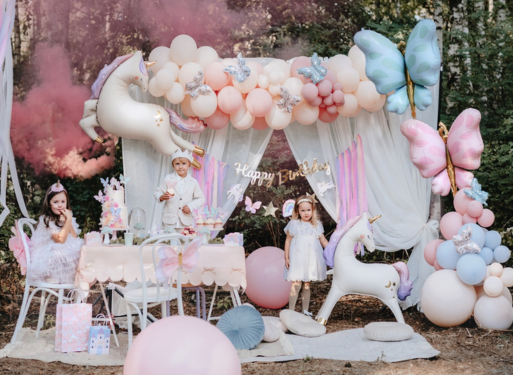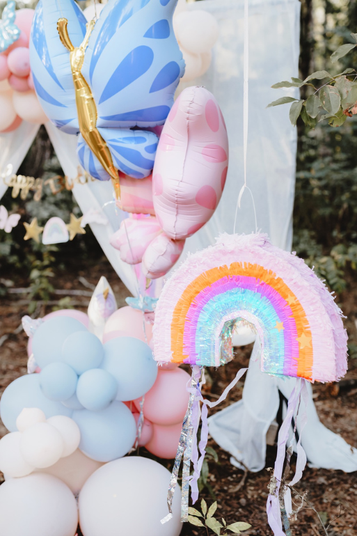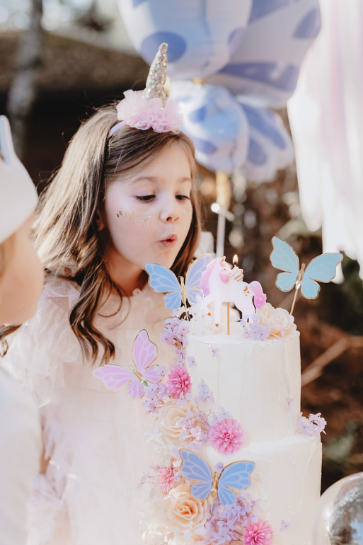 Un anniversaire tout droit sorti d’une forêt enchantée, où licornes, papillons et reflets irisés se mêlent pour créer un décor féerique aux teintes mauves, blanches et rosées.