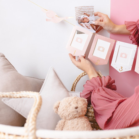 Vous pourrez venir glisser dans chaque fanion une photo de bébé correspond à l'âge indiqué sur le fanion, de 1 à 12 mois.