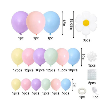 Le sachet contient 102 ballons de taille différentes : 13 cm, 26 cm, 45 cm et 48 cm, il contient également tous les accessoires nécessaires pour réaliser facilement votre guirlande ! Pas besoin d'hélium pour cette guirlande, vous n'aurez besoin que d'un gonfleur manuel ou électrique.