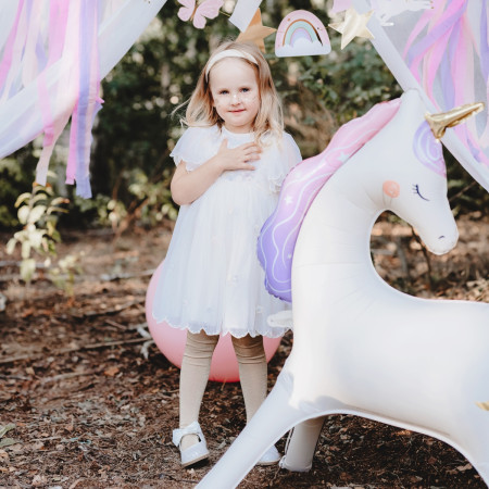 En matière mylar (aluminium), ce ballon "licorne debout" sera parfait pour une fête magique et féerique aux tonalités pastel :)