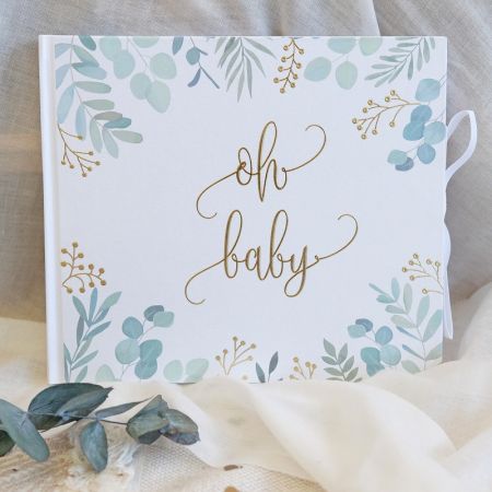 Ce magnifique livre d'or est décoré de jolis motifs végétaux et de l'inscription manuscrite "Oh baby" en dorée.