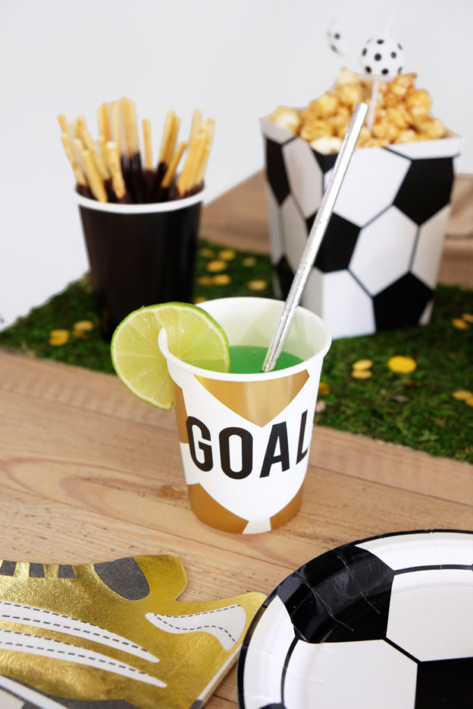 Pour chaque invité, son assiette en forme de ballon de football et ses couverts en bois et étoiles dorées! Oui mais pas que! Chacun dispose aussi d’une belle serviette dorée en forme de chaussure de foot, un gobelet doré et blanc « goal » équipé d’une belle paille couleur argent!
