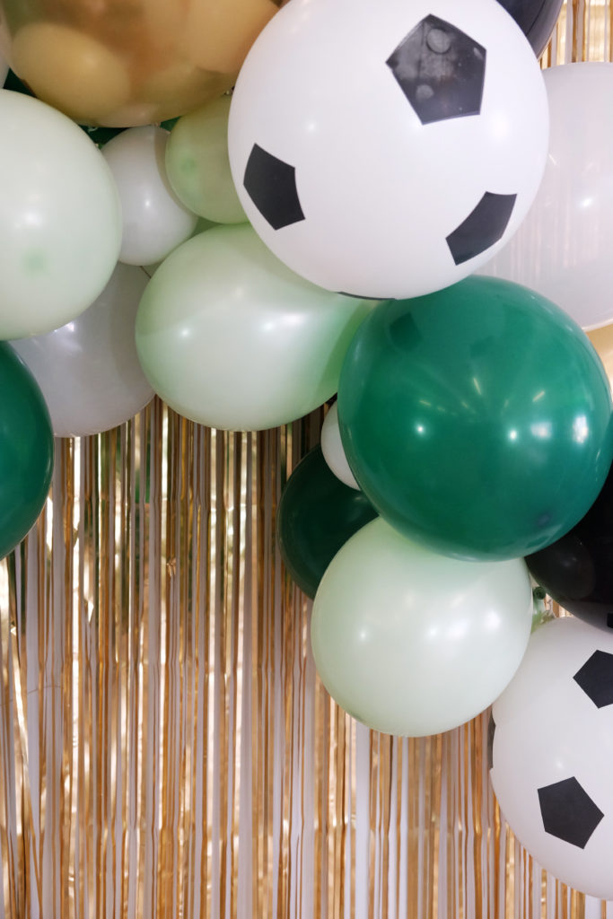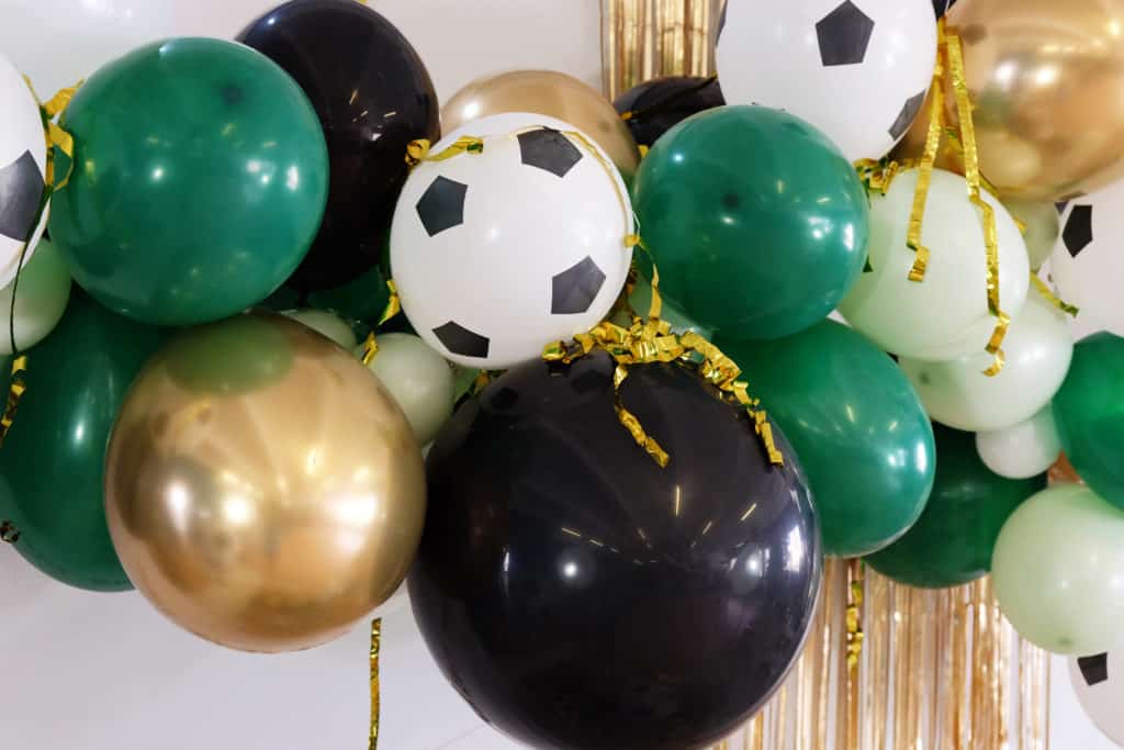 Un joli mélange de doré, noir, vert et des ballons de foot! L’ensemble crée une ambiance très festive! Nous sommes parties sur la base de la guirlande de ballons vert forêt à laquelle nous avons simplement rajouté des ballons en forme de ballons de foot.
