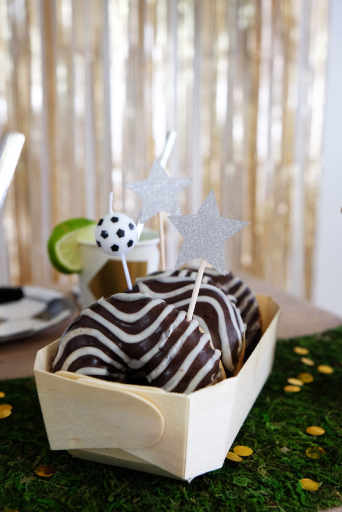 Nous avons disposé les gourmandises dans de belles petites caissettes en bois. Ici les jolis donuts, par exemple, que l’on a piqué de bougies [beaucoup trop mignonnes] en forme de ballons de foot noires et blanches et des petits pics étoiles argentées.