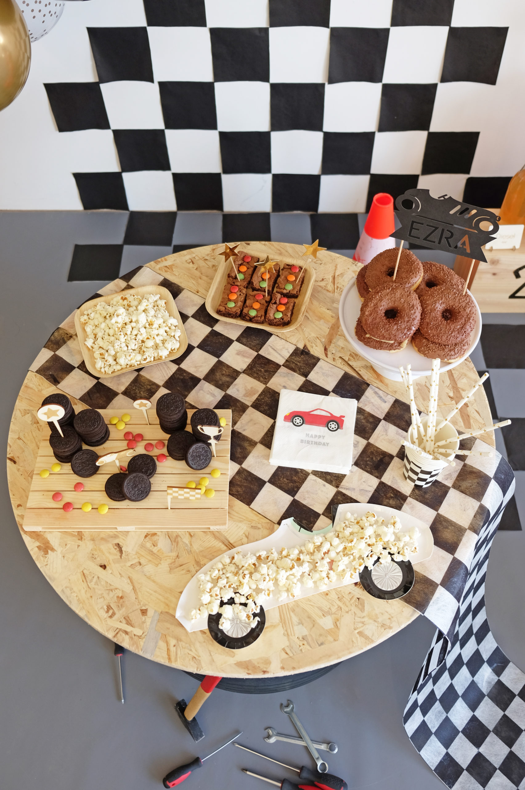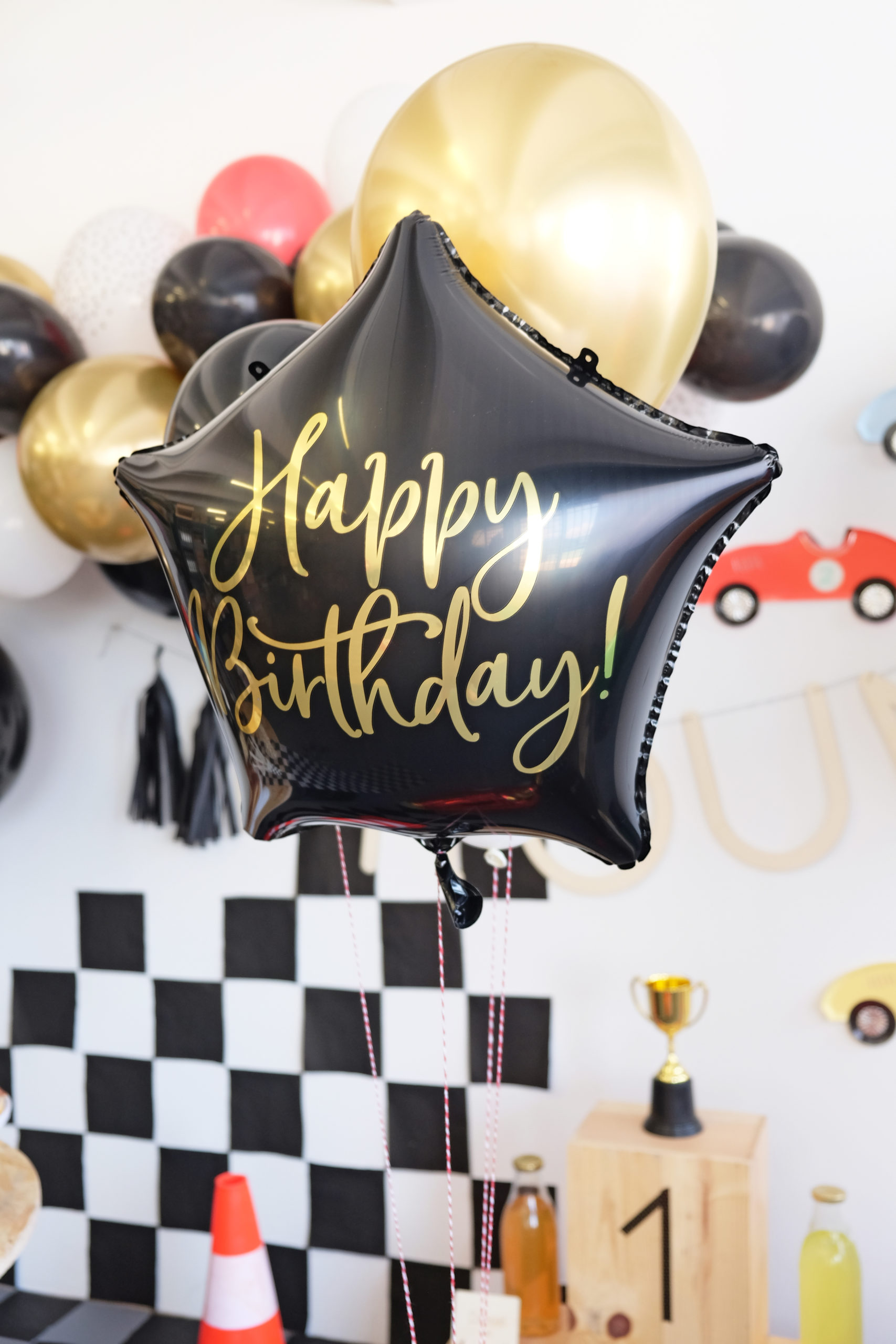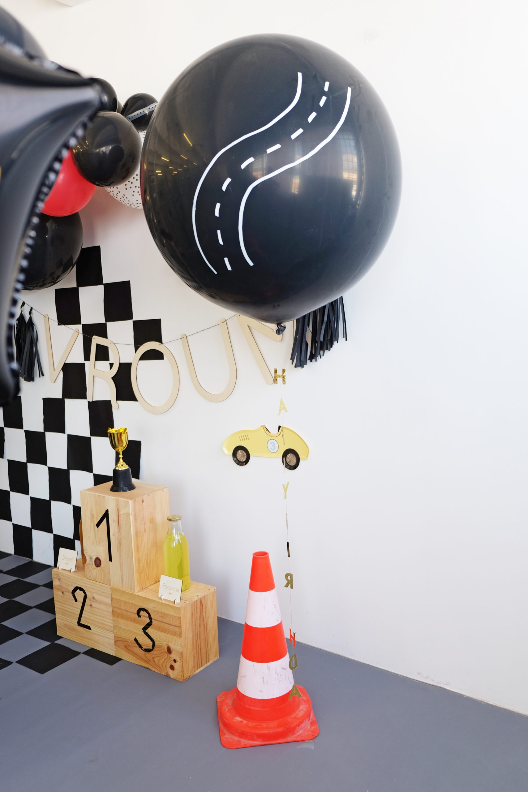 Pour apporter de l’amplitude à la mise en scène, rien de mieux qu’un ballon noir de 1 m gonflé à l’hélium et personnalisé. C’est Alexane qui nous a encore une fois aidé pour dessiner directement au posca une route sinueuse sur celui-ci. Sur le bas du ballon est accroché une guirlande dorée Happy BirthDay qui est également scotchée au sol pour maintenir la globalité. Des serviettes noires découpées et fixées au mur servent de fond en créant un magnifique effet damier.