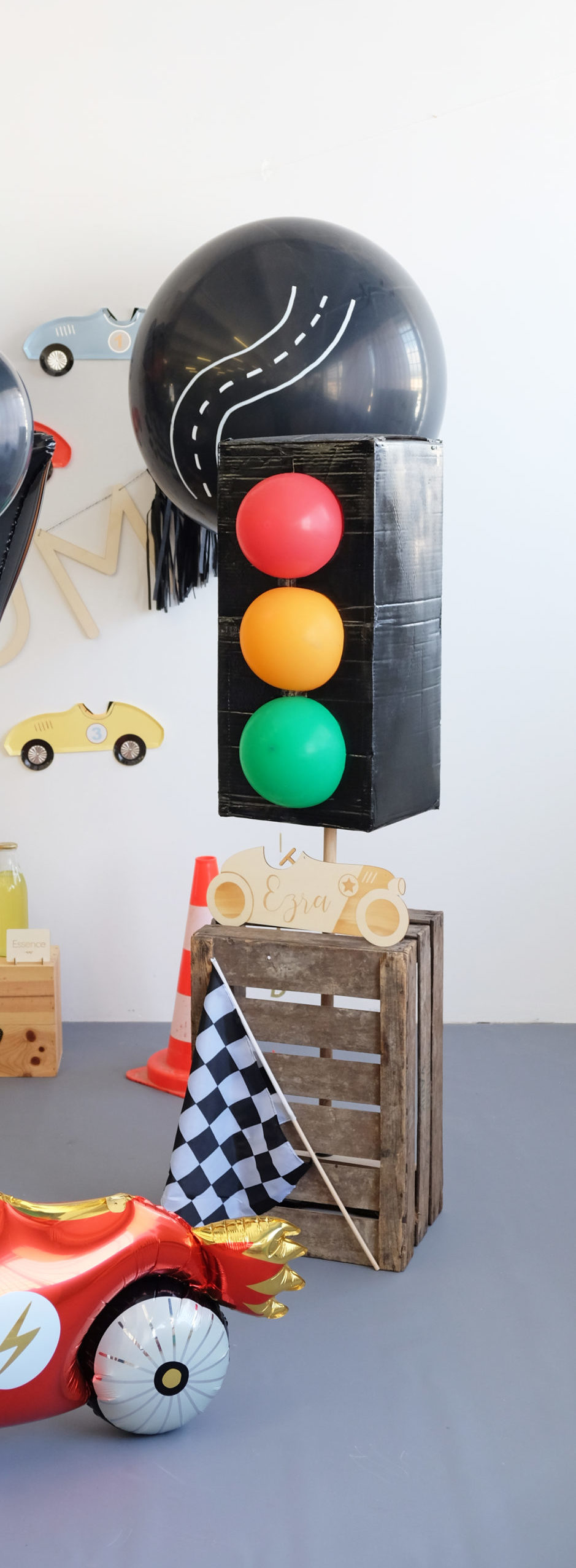 Pour mettre en place cette jolie scénographie, nous avons disposé une bâche grise sur le sol. Nous avons accroché sur le mur, une guirlande de ballons. Notre choix s’est arrêté sur la guirlande pirate. (Mais ? on a dit que c’était un anniversaire voiture !) Oui ! Mais, les couleurs sont en totale adéquation avec l’idée globale de l’événement. Notre petit conseil : ne pas hésiter à utiliser et détourner les guirlandes de ballons même si elles ne correspondent pas à la dénomination de votre thème. De plus, vous pouvez vous amuser à rajouter d’autres couleurs de ballons à la présentation initiale. Le résultat est à la hauteur de nos espérances!