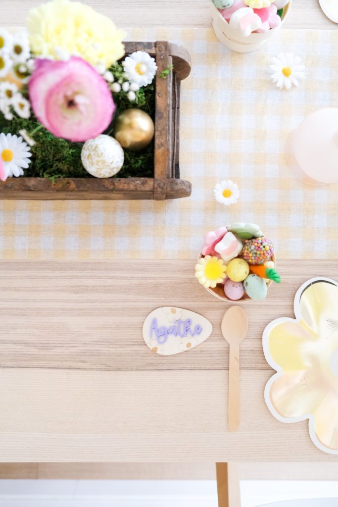 Un bel œuf en bois en guise de marque-place pour chacun des invités, un prénom en plexiglas de la couleur de votre choix et voici une belle décoration réfléchie dans les moindres détails.
