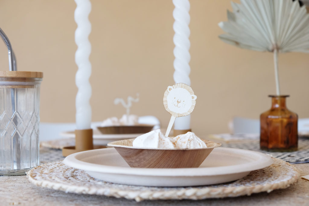 A la place de chaque convive, on y trouvera de super sets de table en jonc sur lesquels sont posées de belles assiettes en carton couleur canne à sucre. Disposez vos gourmandises dans de beaux petits bols en feuilles de palmier.