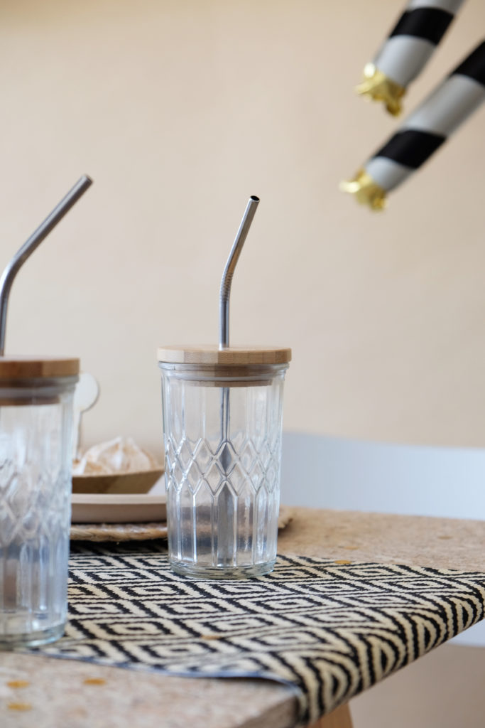 Chacun aura à sa place un super gobelet en verre, couvercle en bois et paille en acier. Ils apportent une jolie touche de modernité à cette belle déco.