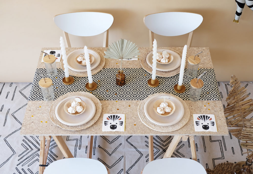 Minimaliste et épuré, le chemin de table apporte beaucoup de chaleur. On adore cet imprimé au motif ethnique. Il comble à lui seul beaucoup d’espace sans que ce soit nécessaire d’installer beaucoup de déco !