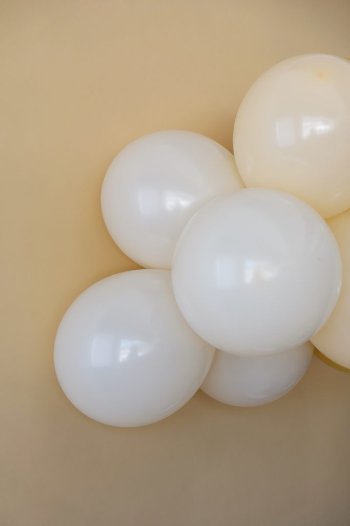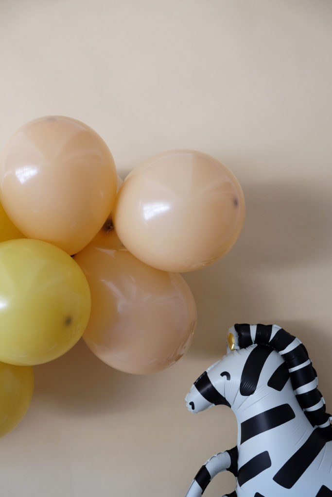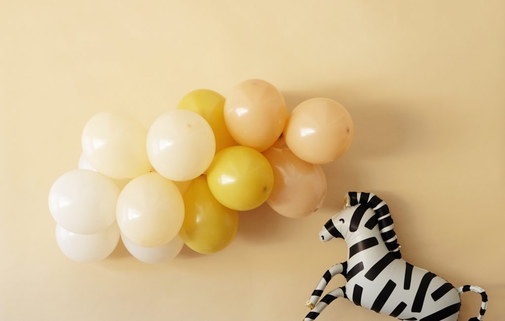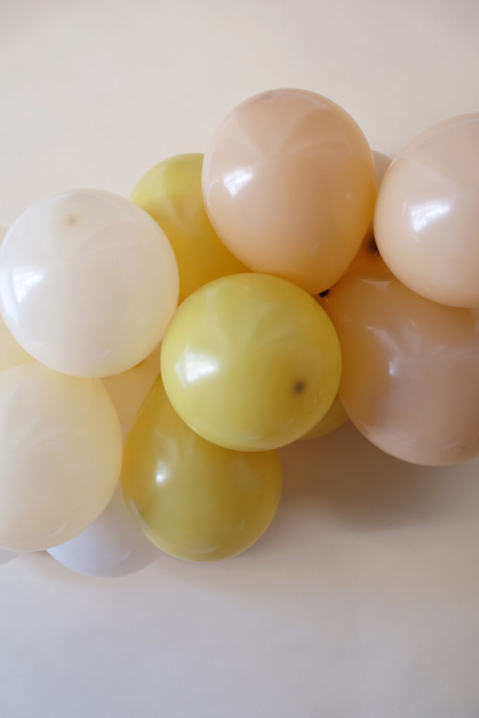 Au fond, vous pouvez admirer une belle grappe de ballons dans un camaïeu de jaune, marron et crème.