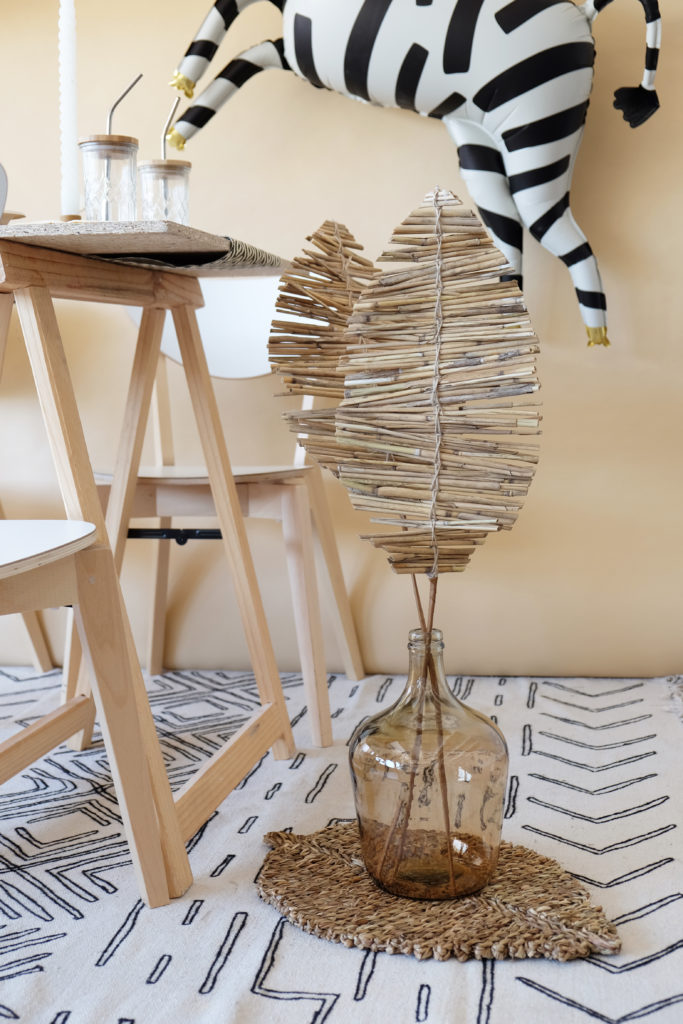 Ensuite, sur le sol, le tapis laisse apparaître une jolie dame jeanne en verre avec de belles feuilles en bambou géantes.
