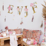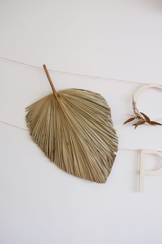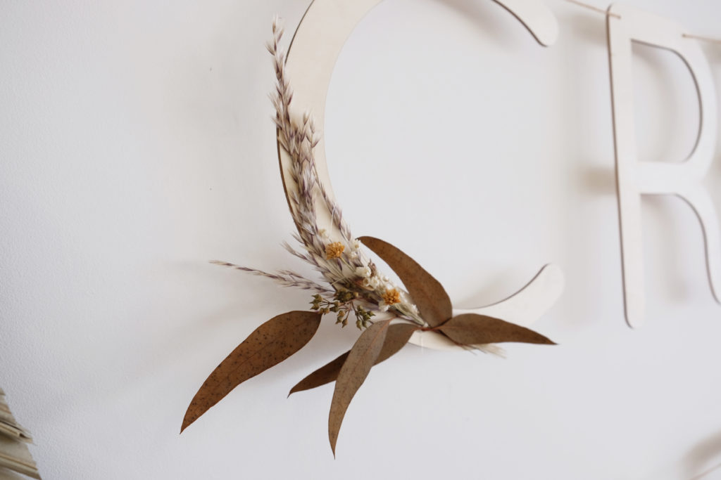 Deux lettres ont été décorées de fleurs séchées telles que de la pampa, de l’eucalyptus rouille et des petites fleurs de nigelle.