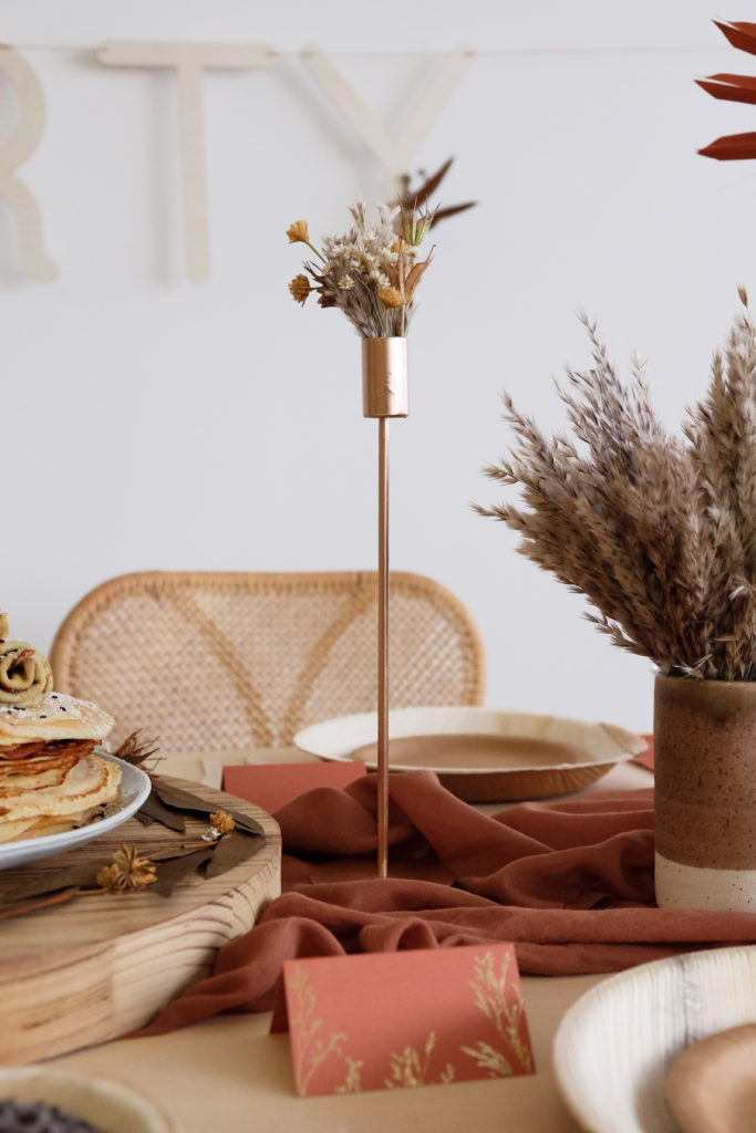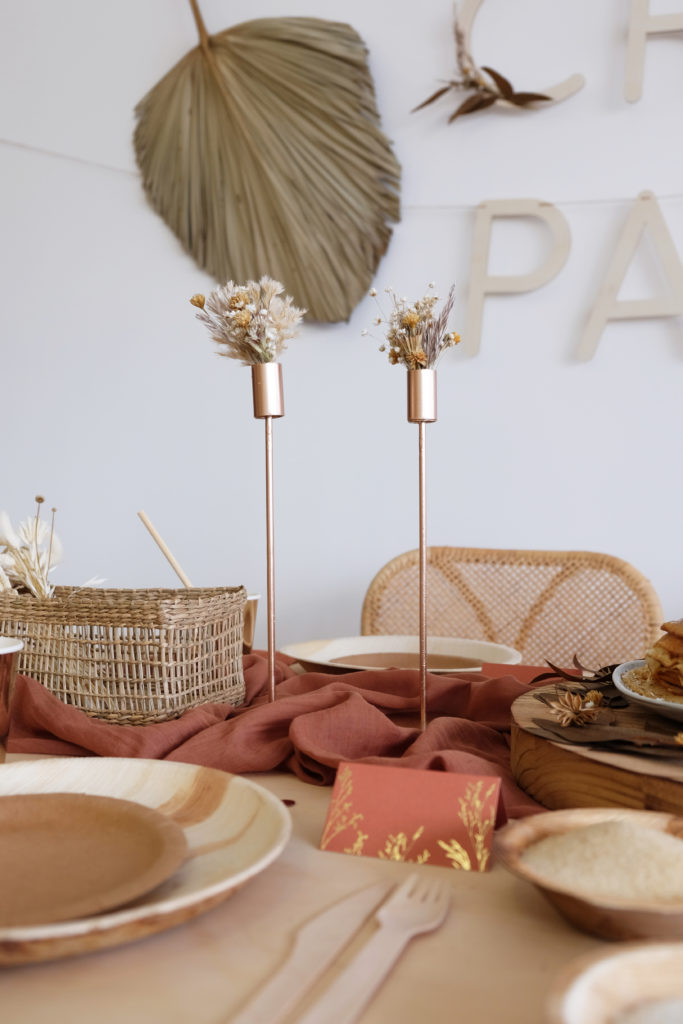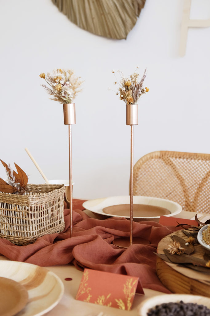 Ensuite, nous avons disposé 3 bougeoirs en métal sur la table. Leur couleur cuivre – rose gold se marie très bien avec le chemin de table terre de sienne.