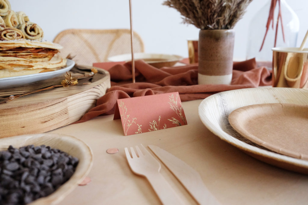 N’hésitez pas à marquer le coup avec des détails : les marque-places en carton de couleur rouille, et les serviettes assorties!