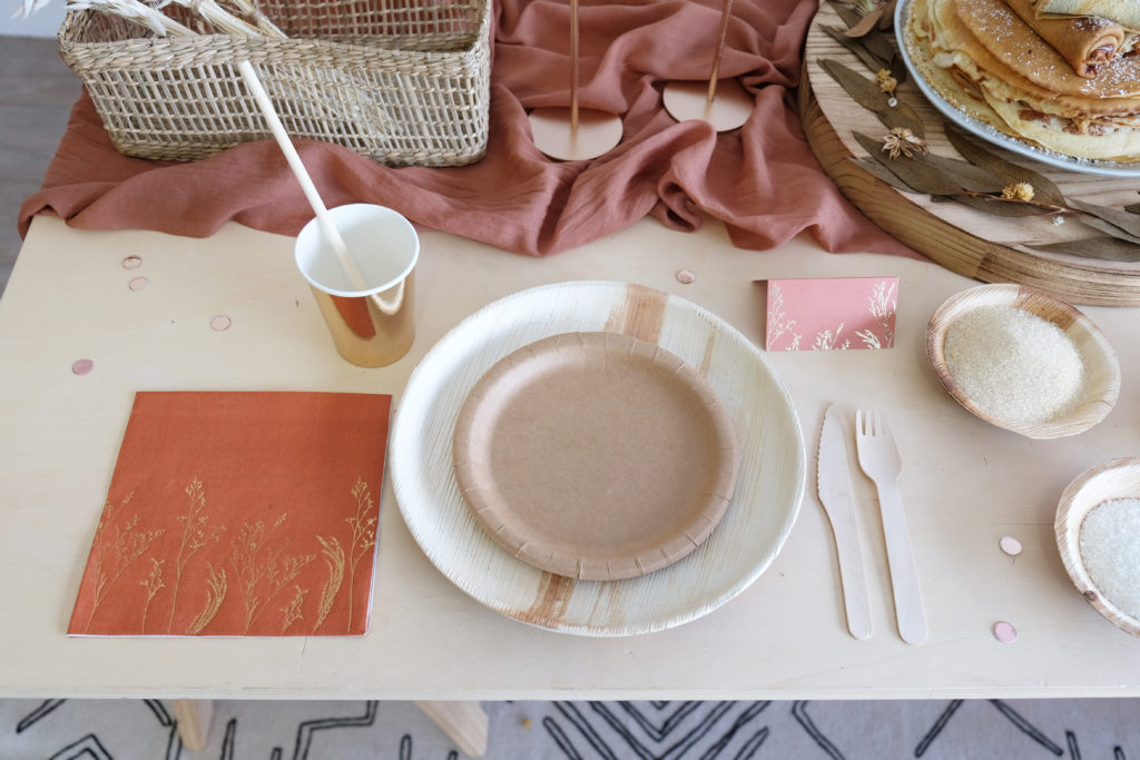 A chacune des places assises, nous avons disposé nos belles assiettes en feuilles de palme superposées des assiettes en carton de couleur kraft.