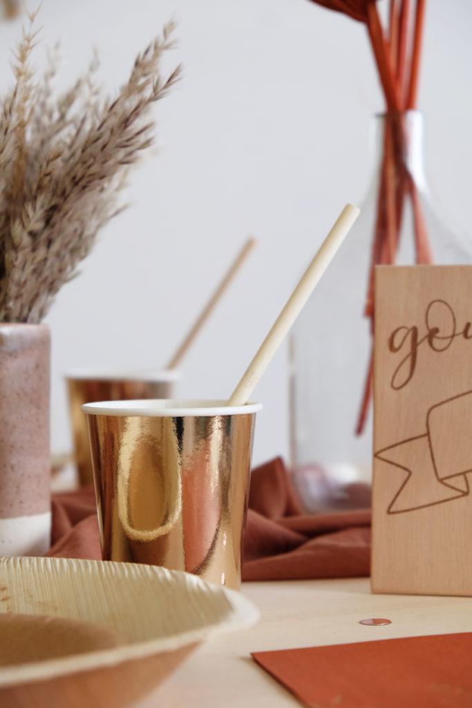 Placez les couverts en bois (couteau et fourchette), les gobelets dorés et les pailles en bambou!