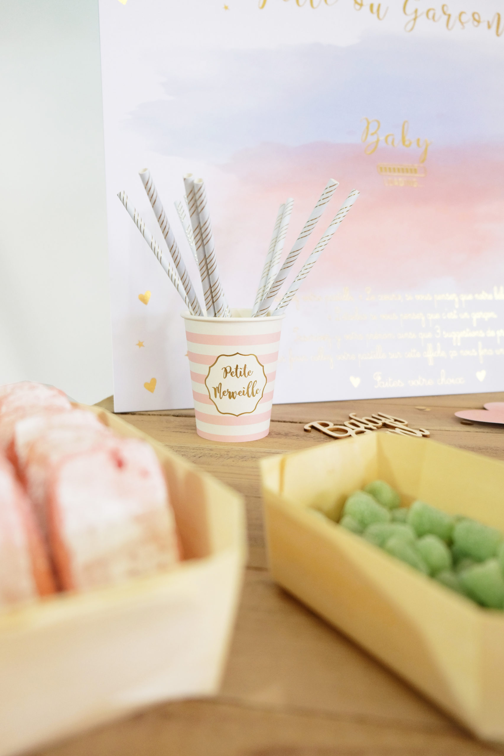 Nous avons ensuite éparpillé sur la table des jolis confettis en bois « baby girl » et « baby boy »! Suspenseeeeee