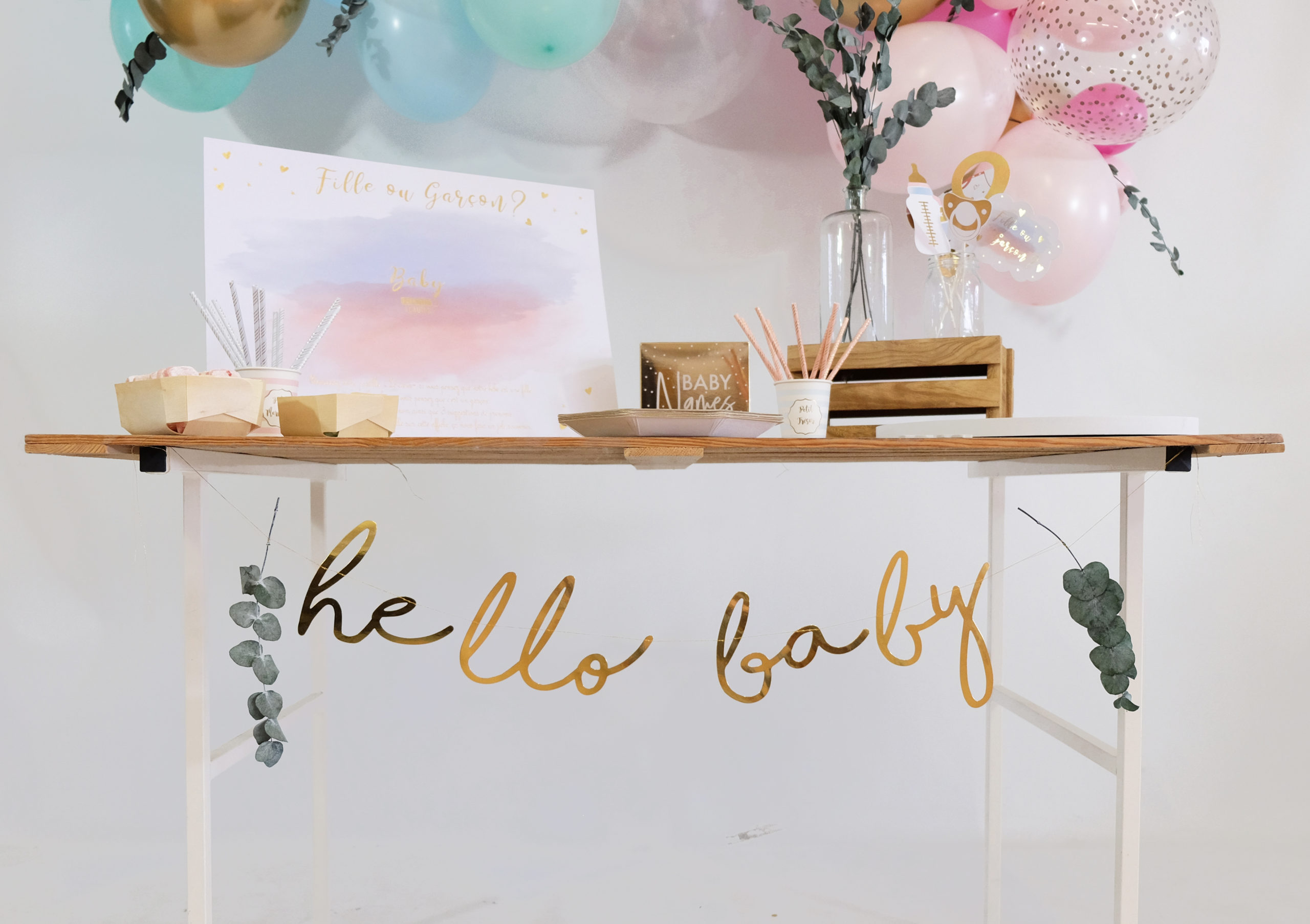 Nous avons commencé par décorer le devant de la table à l’aide d’une belle guirlande « Hello baby » dorée.
