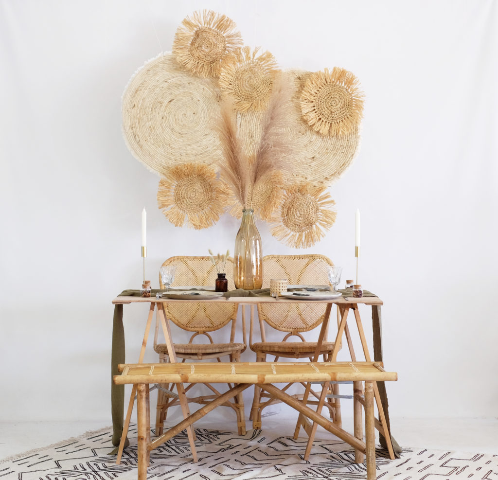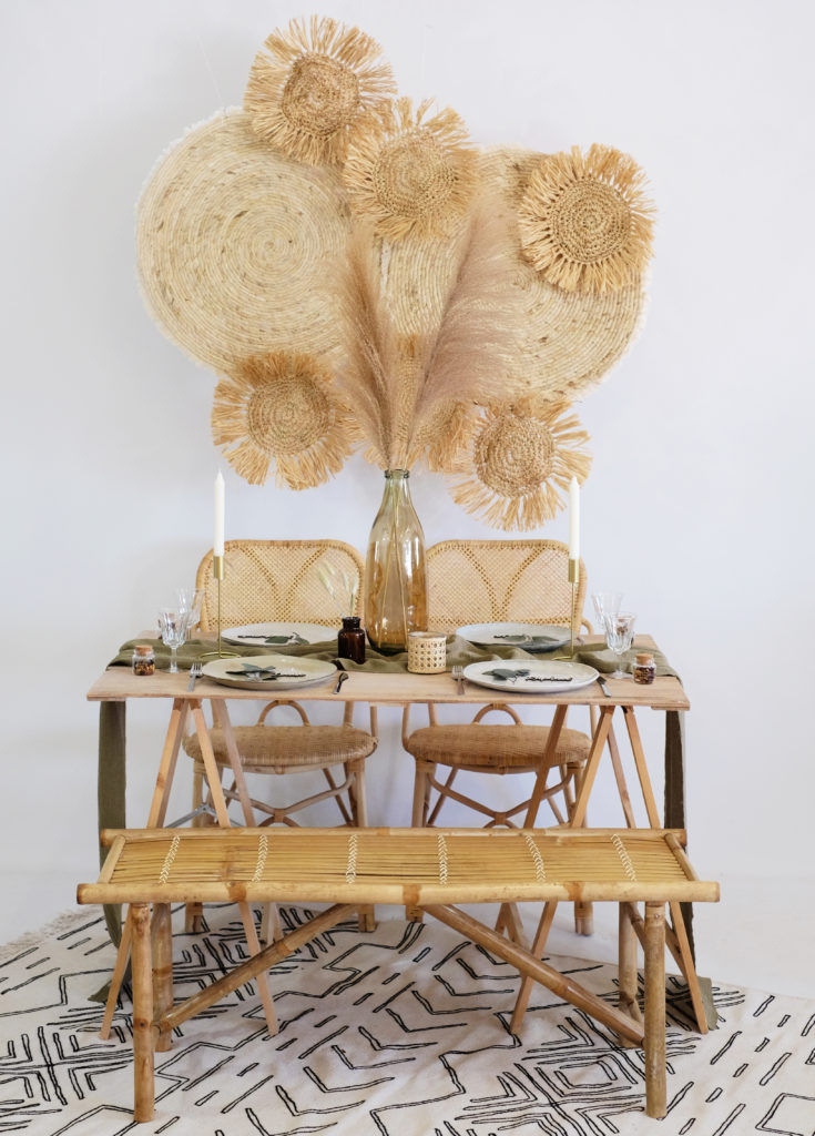Ici, nous avons simplement utilisé des suspensions rondes en jonc et aux bords à franges! Nous en avons utilisé 2 que nous avons superposées de centres de table en raphia. Ici, nous en avons utilisé 6 mais libre à vous d’en mettre le nombre que vous souhaitez en fonction de l’effet recherché.
