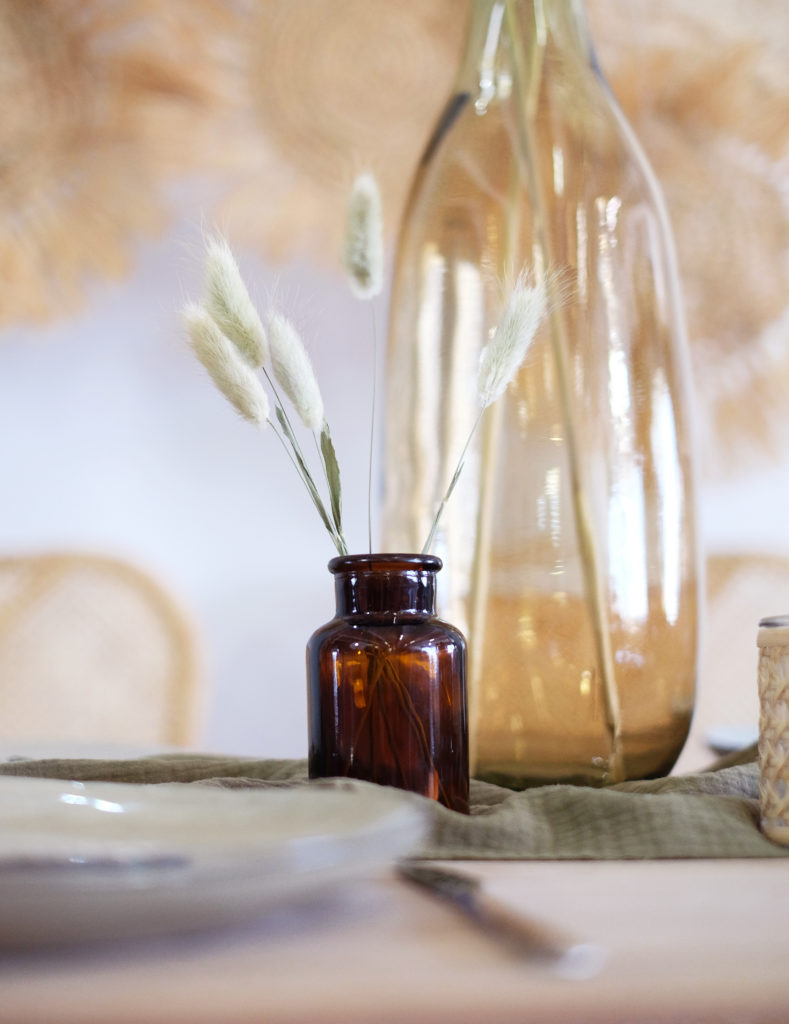 Nous nous sommes aidées de la fiole d’apothicaire en verre pour ajouter une petite touche cendrée. Son aspect ancien apportera un côté bohème qu’on adore! A l’intérieur, des brins de plumeaux lagurus!