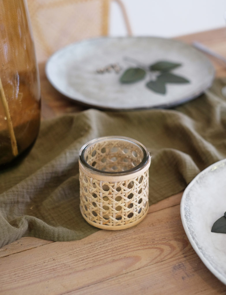 Parce qu’on n’a jamais assez de touches lumineuses sur la table, nous avons ajouté une petite touche bohème grâce à nos petits photophores en verre et cannage.