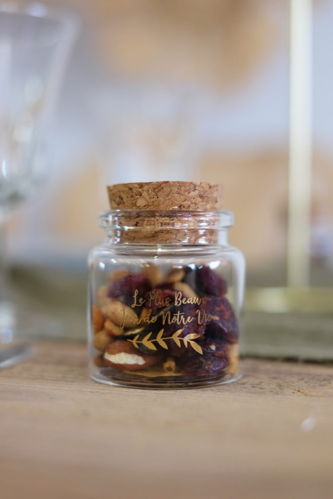 A chaque place invité, n’hésitez pas à leur laisser des petits présents! Ici, on a misé sur de jolies petites fioles en verre et au couvercle en liège avec la belle inscription dorée » Le plus beau jour de notre vie ». A l’intérieur? Des petites graines, du thé, des friandises…tout ce qui peut faire plaisir et réchauffer le cœur!
