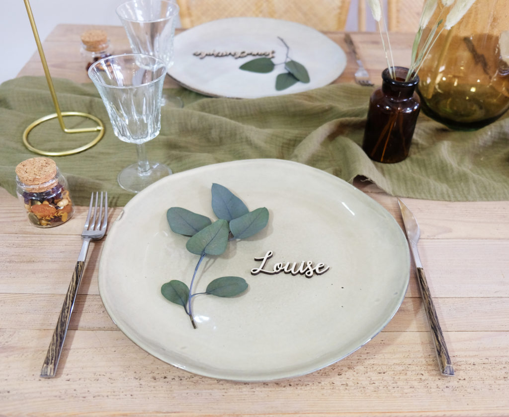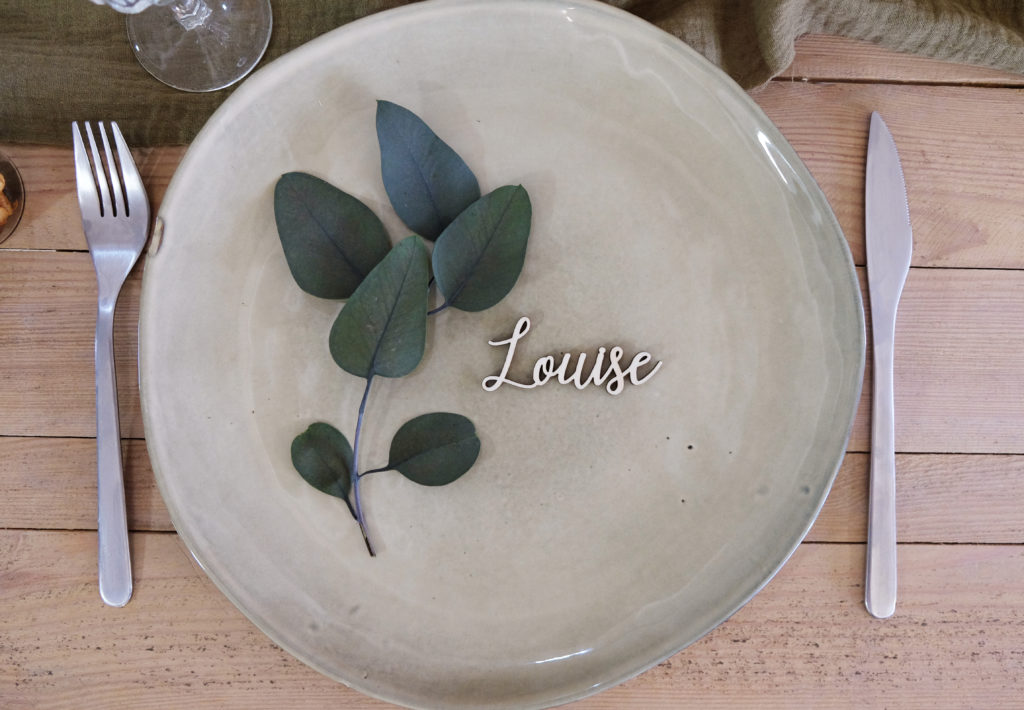 Utilisez de jolis marque-places en bois personnalisables! Cela habille votre assiette et c’est une belle déco raffinée! Une petite branche d’eucalyptus populus pour accompagner et hop le tour est joué!