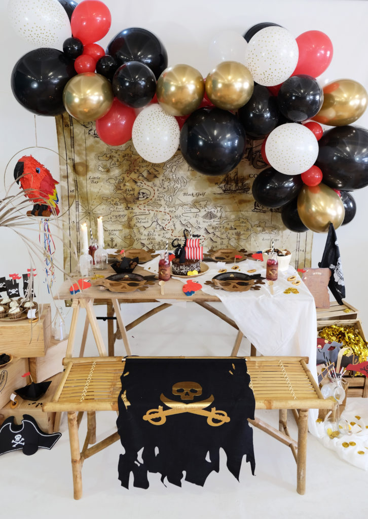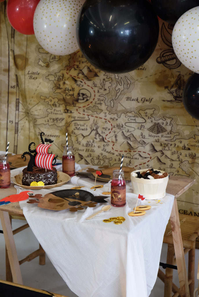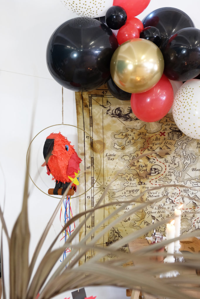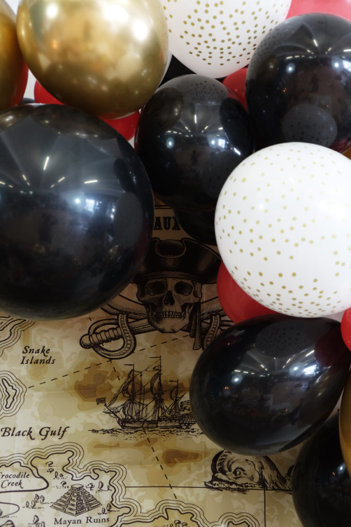 Sous votre guirlande de ballons, suspendez une toile tendue en tissu…elle représente une carte vieillie de carte aux trésors! L’effet est incroyable, de quoi vraiment se croire au beau milieu de boucaniers!
