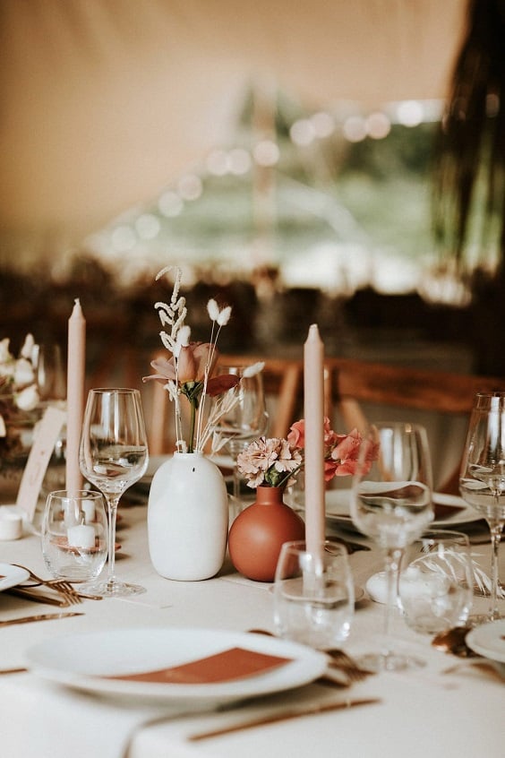 En centres de table ou en accessoires de décoration, n’hésitez pas à jouer sur les volumes avec des chandeliers, des bougeoirs et de jolis cierges dans des tons nude, crème, blanc…