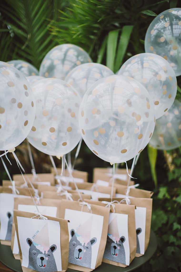 Une façon originale de remercier les petits invités en accrochant des ballons transparents aux imprimés dorés à vos petits sachets kraft !