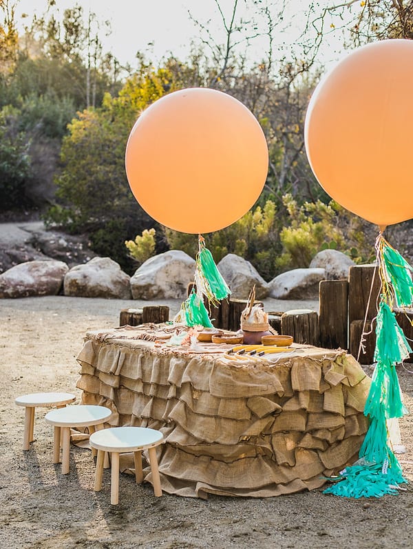 Et des fois, pas forcément besoin d’une tonne de ballons ! 2 ballons couleur orangé de 1 mètre assortis à des guirlandes tassel menthe et doré….le ton de votre fête est donné !