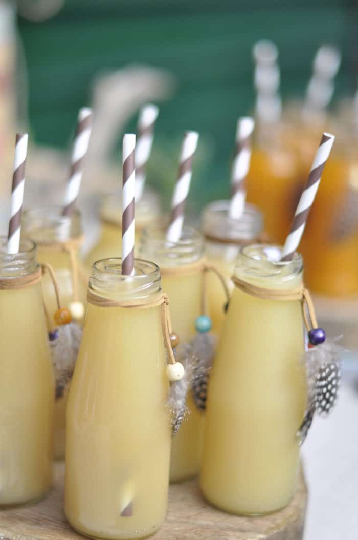 Ce thème vous permet de pouvoir allier de nombreuses couleurs chaudes. Le jaune, le marron, le bleu se marient super bien ! Faites un super cocktail [bon pas trop original histoire que la boisson plaise aux petits loulous] et disposez-le dans de jolies petites bouteilles de lait.