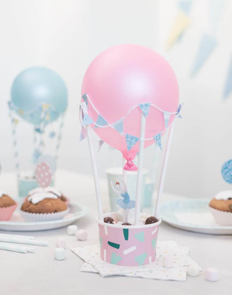Commençons par les ballons ! Ballon rose satin, bleu pastel, blanc satin…un joli pot à glace (pour y mettre toutes les gourmandises que vous voulez), de trop belles pailles, une petite guirlande esprit pastel (que vous pouvez couper pour monter d’autres montgolfières) et le tour est joué !