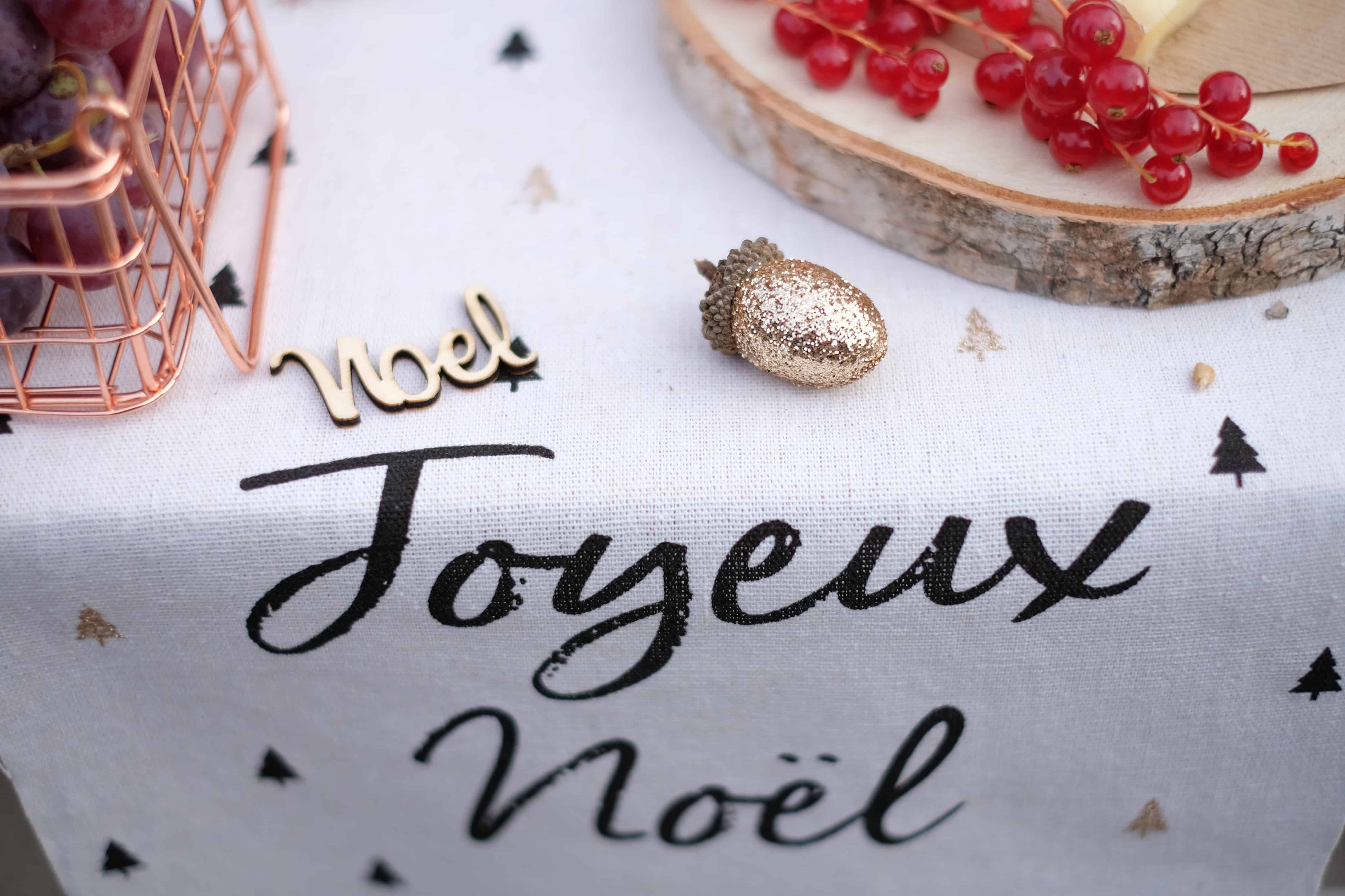 Vous voulez cacher une table pas géniale ou qui n’a pas trop d’intérêt ? Misez sur le petit chemin de table de Noël ! Il est au TOP ! En lin, écriture noire et petits sapins dorés…Ho, Ho, Ho, Noël arrive !! Ne lésinez pas sur les petites déco en complément ! Gland pailleté, les confettis en bois « Noel »…bref restons dans le même esprit mais toujours avec des petites touches de folie !!