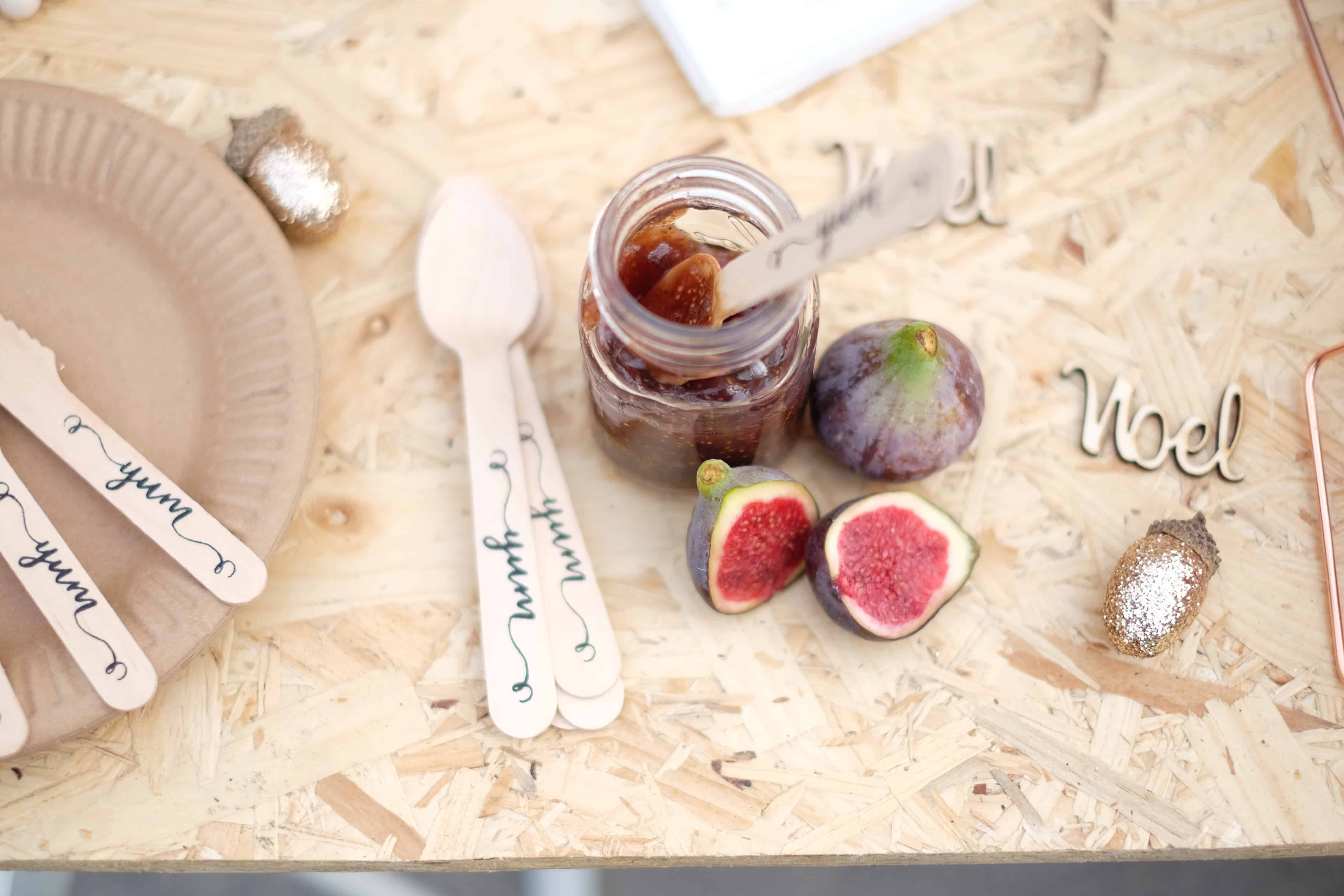 Bon et parce qu’on est TOUTES un peu gourmandes….nous avons choisi de déguster nos fromages avec une petite confiture de figues hummmm ! Autant vous dire…on s’est régalées !!!! Dans un petit bocal transparent avec des couverts en bois Yum, le rendu est GÉNIAL !