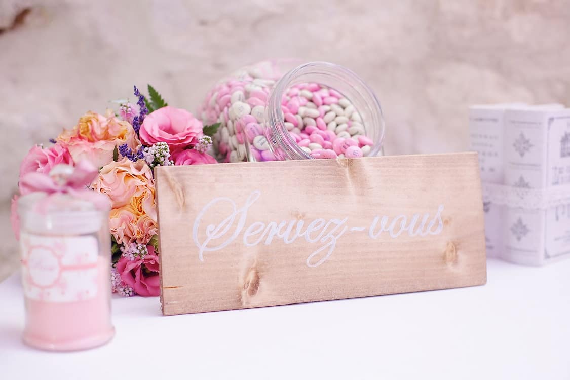 Pour la table où les invités signent le livre d’or, Mélanie a choisi une jolie décoration dans les tons roses avec des m&ms personnalisés (miam), des valisettes liberty, cubes en bois LOVE, panneau en bois « servez vous »…