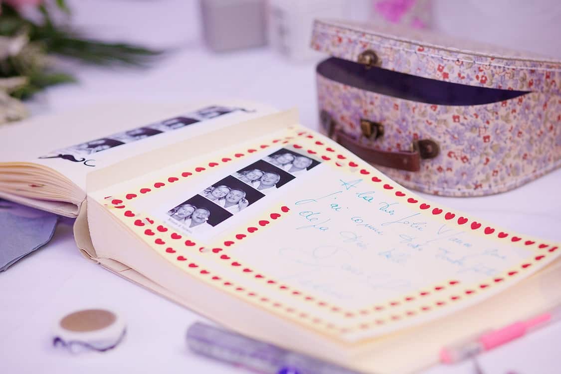 Pour le livre d’or, la bonne idée à copier, les invités se prennent en photo et laisse un mot aux mariés à côté.