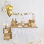 Éparpillée sur la table, la jolie vaisselle jetable mixte remplit toutes les missions ! De jolies assiettes à festons dorés ! Les belles assiettes « Oh baby » apportent une jolie touche dorée ! Et les trop jolies serviettes blanches décorées des trois couleurs !