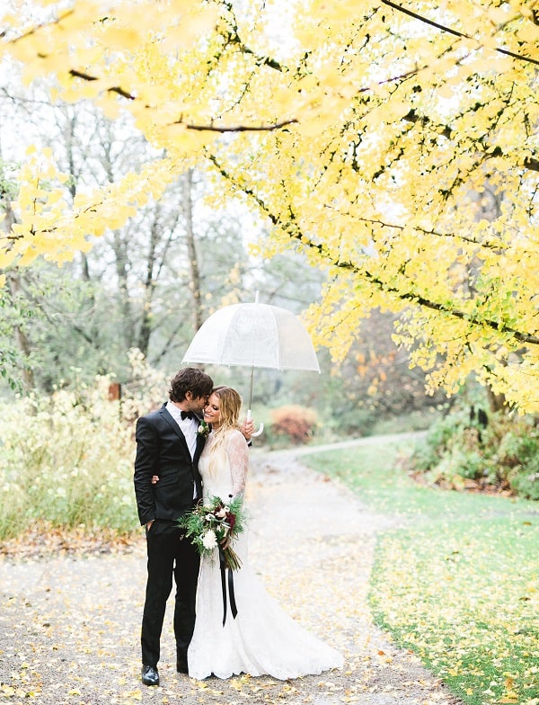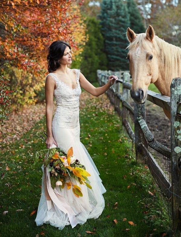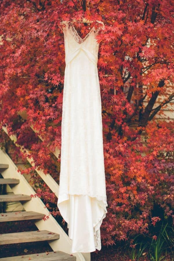 La traditionnelle photographie de la robe de mariée sur cintre sur un érable rouge, c’est tout simplement splendide.