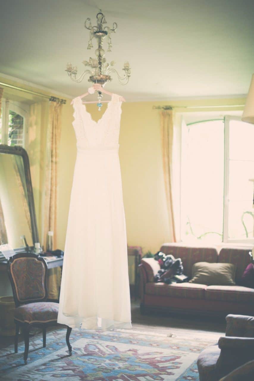 Dans un joli salon rétro, robe de mariée suspendue au lustre sur un cintre personnalisable noté ici « the bride »