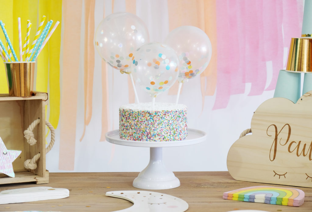 Ensuite, en terme de décorations, nous y avons planté de magnifiques cake toppers composé de 5 mini ballons et…remplis de confettis ! On adore !