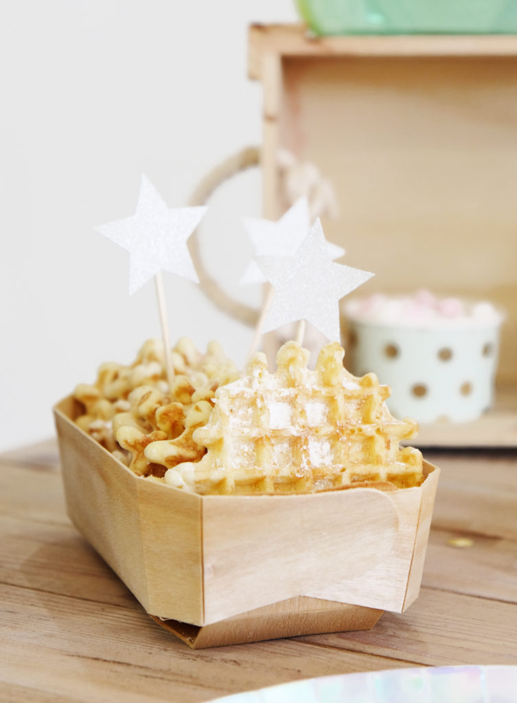 Les gaufres dans une petite caissette en bois ! Oui mais pas que ! Nous avons également planté de jolis petits pics étoiles argentées. Oui parce que notre monde est rempli de féerie !