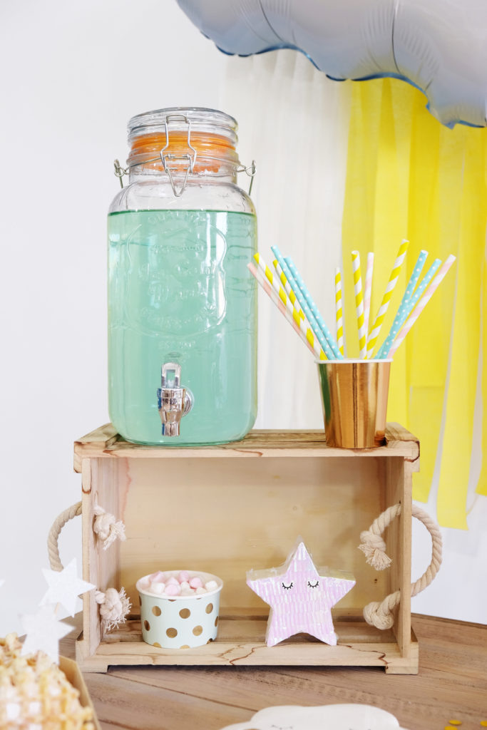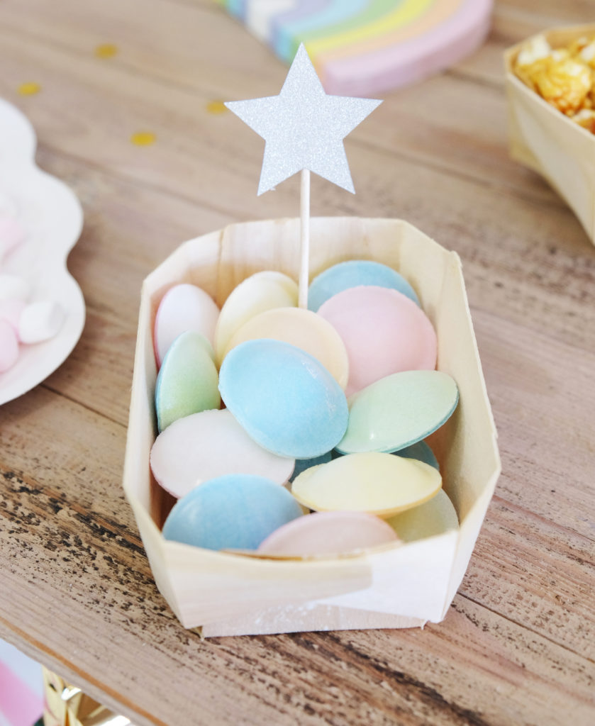 En terme d’accessoires, nous avons placé un pot à glace dans lequel sont nichés des beaux petits chamallows et une mini pinata étoile irisée (beaucoup trop canon pour sa taille 😉 )