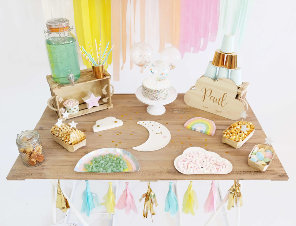 De belles assiettes en forme de lune, un autre modèle d’assiettes en forme d’arc-en-ciel, des serviettes en forme de nuage (et aux pommettes dorées) et un autre modèle de serviettes en forme d’arc-en-ciel.