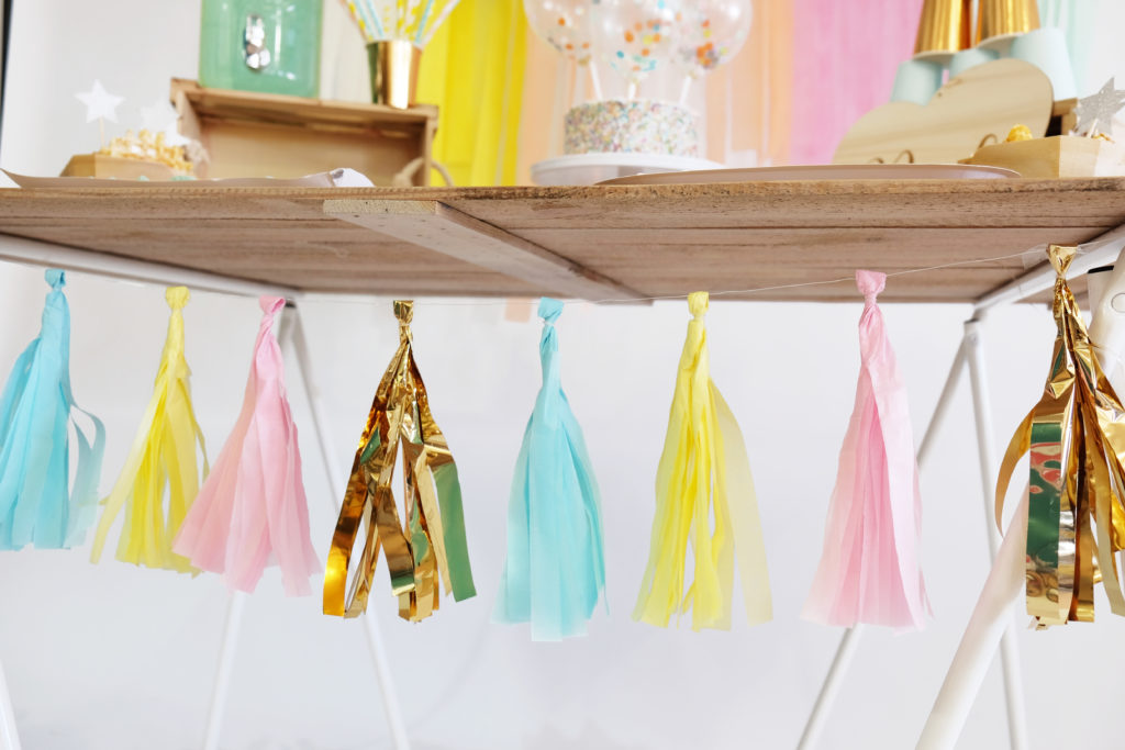 Commencez par suspendre une belle guirlande tassel pastel sur le devant de votre table.
