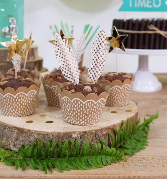 Pour l’occasion, disposez de beaux et moelleux muffins que vous pouvez installer dans de beaux moules à cupcakes. En carton et de couleur kraft, les résultat est top ! Piquez-les de pics à cupcake étoiles dorées pour apporter un petit côté épuré à votre déco ! Nous y avons également planté de belles petites plumes que nous spécialement réalisées avec du masking-tape ! [ à découvrir juste après dans la partit DIY ] 🙂