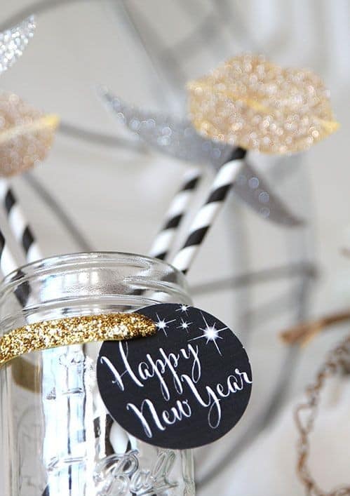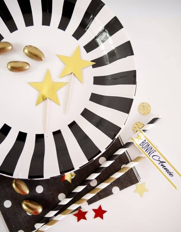 Or et noir ou blanche et argentée, n’hésitez pas à réutiliser vos déco de Noël pour décorer votre table du Nouvel An!