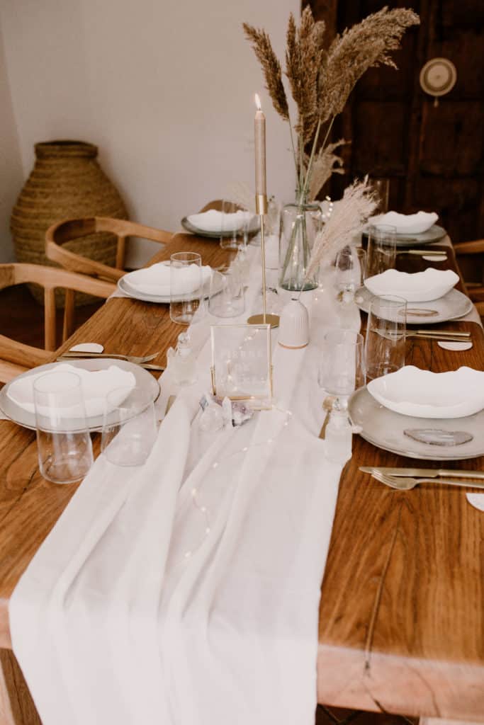 Nous avons commencé par étendre un joli chemin de table en mousseline de coton blanc de 5m de long. Sa matière douce et fluide vous permettra de le froisser facilement ou de le laisser se poser naturellement. Comme bon vous semble !