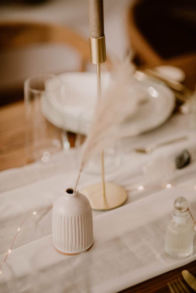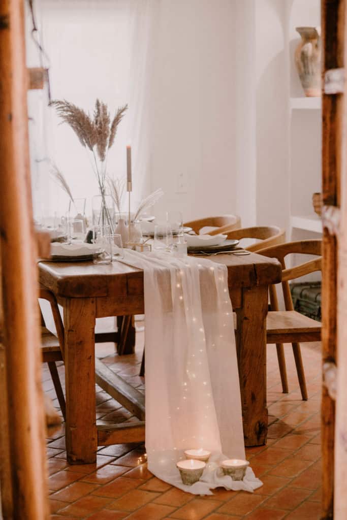 Une jolie guirlande lumineuse est installée en soupçon sous le chemin de table. Quelques pots en argile laissent apparaître de belles bougies blanches.